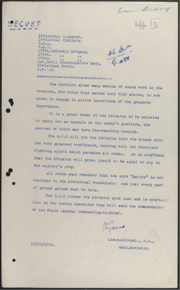The Division was moved down from Ypres at the end of September and spent some time rotating in and out of trenches around the area of Loos, an area that was completely unfamiliar to all, after six months in the Ypres Salient. The orders for the division were to take the German positions in and behind the Hohenzollern Redoubt including the Corons de Maron, Corons de Pekin and the Dump. The attack would start from British positions already in the redoubt itself, from a trench known as ‘Big Willie’. The attack was to start in the afternoon of the 13th October and was to be undertaken by the 137th (Staffordshire) and 138th (Lincoln and Leicester) Brigades on the right and left respectively. The chief of the divisions General Staff – Lt Col Game – issued a memo to the troops, which makes for quite stirring reading below. Certainly, spirits must have been high among the troops, who finally had a chance to show what they could do: