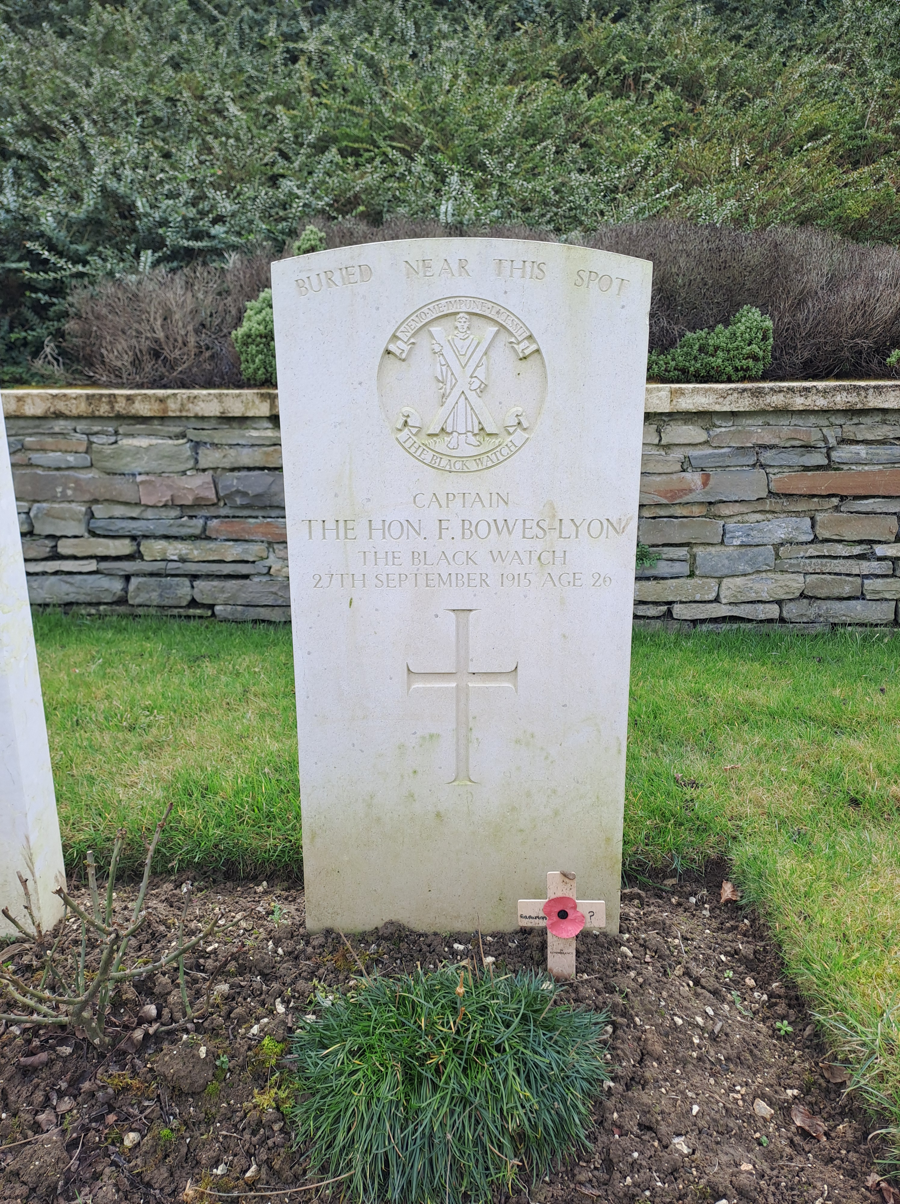 This location really is a key site in understanding the topography and how that impacts the choices made by the British and the Germans of where and how to build defences, trenches and so on. You can see this additionally from Quarry Cemetery, a short walk from the redoubt. Seen on the left-hand side of the map above, sitting just behind the front line, this quarry was used as a burial site from June 1915 – another example of a battlefield cemetery. There are over 100 burials in this cemetery – with 10 unidentified and many headstones that also have the words of ‘Buried near this spot’ upon them. This includes one Fergus Bowes-Lyon, an elder brother of the Queen Mother. Originally noted as missing on the Loos Memorial, evidence of Fergus’ burial somewhere in the quarry was accepted in 2012.