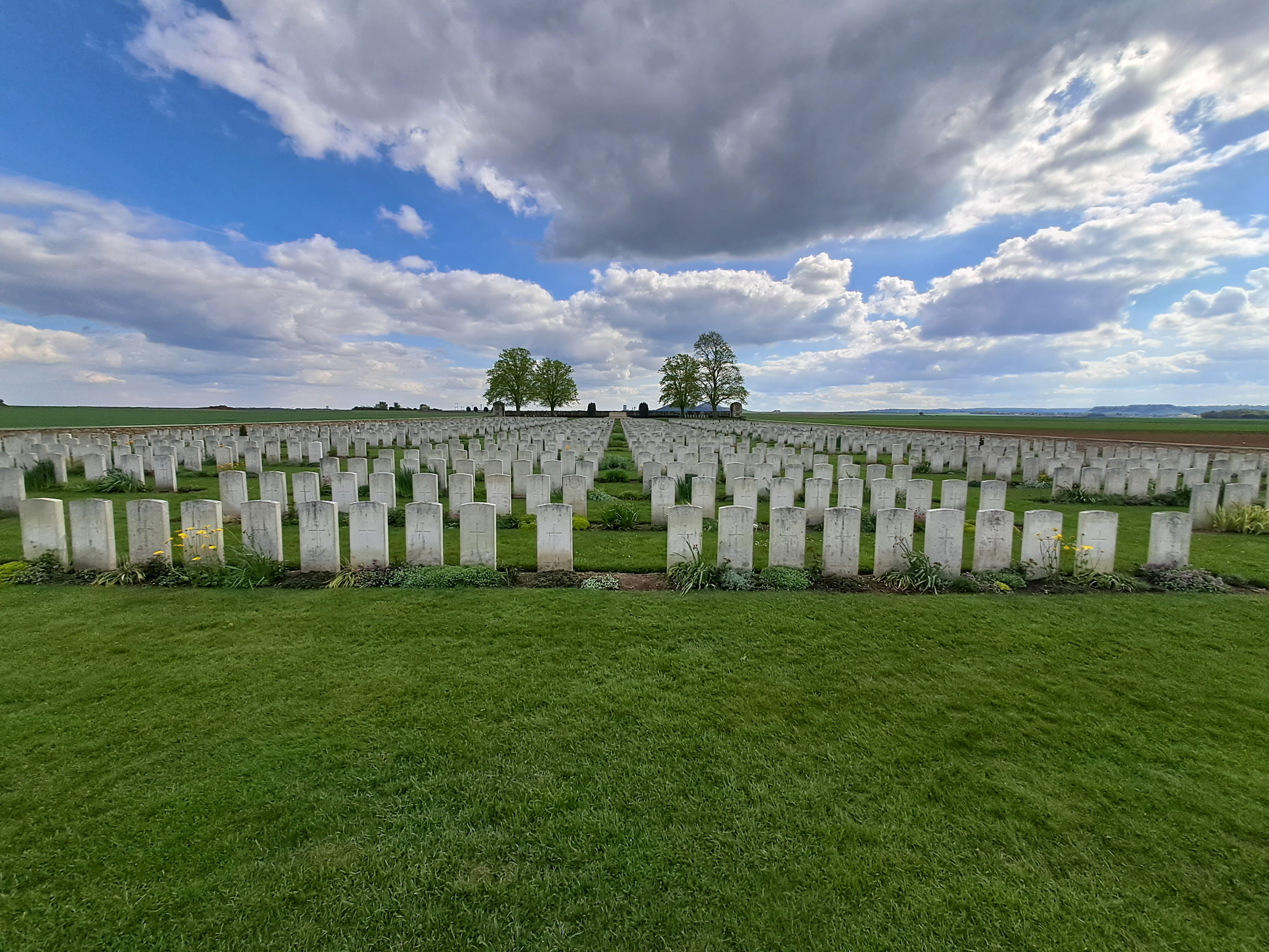 The second, just behind St Mary’s ADS, is Ninth Avenue Cemetery. This is what is called a battlefield cemetery, one that was created during the war and is still in the same location. This cemetery was named after a trench of the same name that ran through the area. It is an uncommon type of cemetery as the majority of those buried here were buried in what is essentially a mass grave. These men were brought here after the battle was over. The front lines had moved forward and parts of the land behind had their uses changed, including being used for burial sites. There are 46 burials here, and those who were buried in the communal grave have headstones commemorating them plotted around the edges of the cemetery.