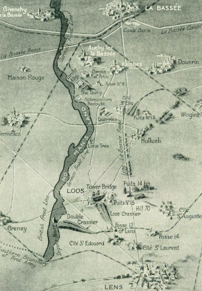 25 minutes north of the city of Arras and on the outskirts of the city of Lens, there lies a village called Loos-en-Gohelle. Historically a heavy mining and industrial area, with slagheaps dominating a flat landscape, the village and those surrounding it were at the heart of a major offensive in September and October 1915 – the Battle of Loos. Even though it was a supporting offensive for the more extensive French Third Battle of Artois, this battle can be considered the first truly large-scale offensive carried out by the British, earning the moniker at the time of ‘The Big Push’ and is notable for being the first time the British used Chlorine Gas as a weapon. Whilst carried out on a ground not of their choice, and right in the heart of the 1915 Munitions crisis, the best of a difficult situation was made and on the first day of the attack – 25th September – there were some breakthroughs made. Some other particularly key dates in the battle were the 8th and 13th October, but the fighting was sustained over the whole period. The offensive lasted for almost three weeks with more than 60000 British casualties.