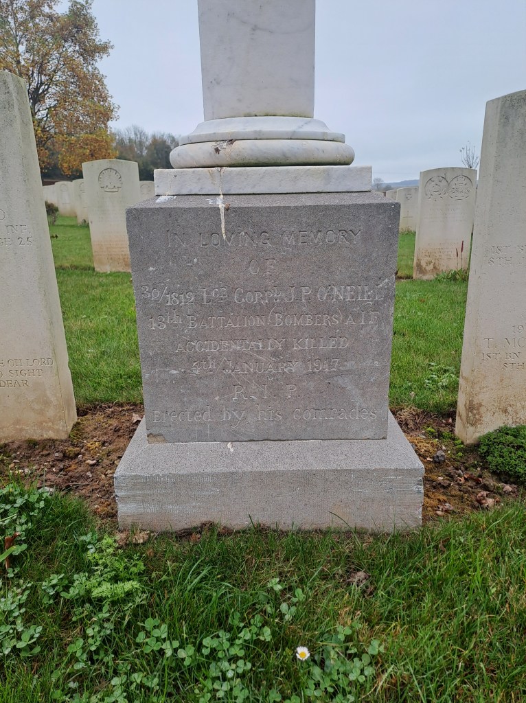 ‘In loving memory of 30/1812 Lance Corporal J.P. O’Neill, 13th Battalion (bombers) AIF, accidentally killed 4th January 1917. R.I.P. Erected by his comrades’